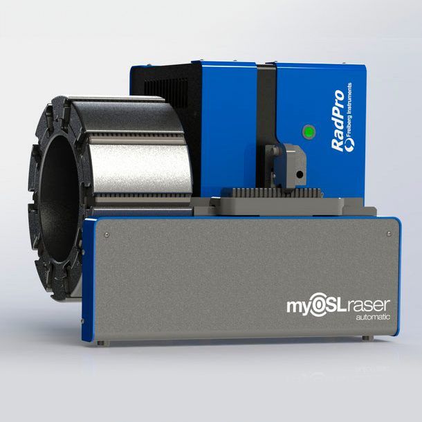 O modelo myOSLraser 2.0 é um dispositivo automático para avaliação dos dosímetros OSL da RadPro, chamados myOSL, com capacidade para leitura de um único dosímetro ou pode ser equipado com alimenração automática para até 200 dosímetros.