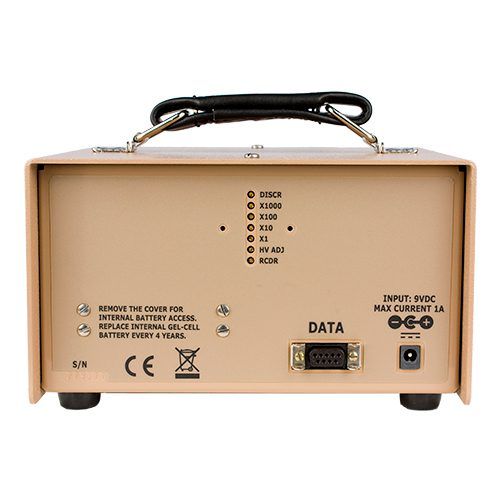 Ele suporta detectores de radiação tipo Geiger Muller e cintilador e mostra os resultados em um display analógico com 4 opções de escala. Possui alarme visual e sonoro com volume ajustável no painel.