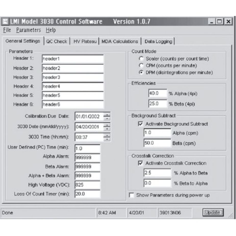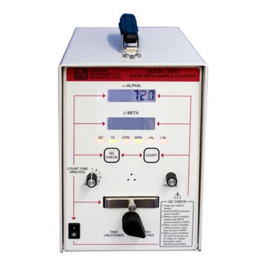 O contador de amostras modelo 3030 possui um detector interno tipo cintilador plástico ZnS(Ag) com bandeja para amostras de aço inoxidável com 5,1 cm de diâmetro. Esse sistema combinado fornece leituras em displays LCD retroiluminados independentes para mostras as contagens discriminadas para radiação alfa e beta.