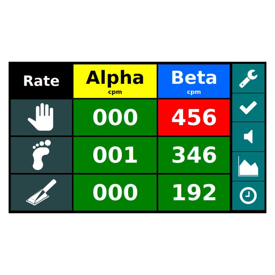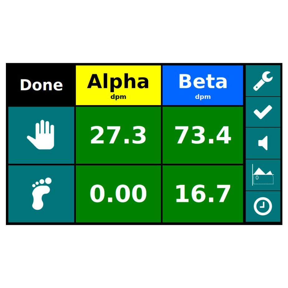É utilizado um modo de mínimo tempo para determinar automaticamente o tempo de contagem baseando-se nos valores de radiação de fundo, níveis de alarme selecionados e outros fatores, quando a contagem é finalizada, uma mensagem de “Clean” ou “Alarm” é apresentada caso não haja contaminação ou ela esteja presente, respectivamente, de acordo com os níveis de alarme configurados. Também é possível utilizar o equipamento no modo que ele mostra as taxas de contagem atuais ou a taxa de radiação de fundo acumulada.