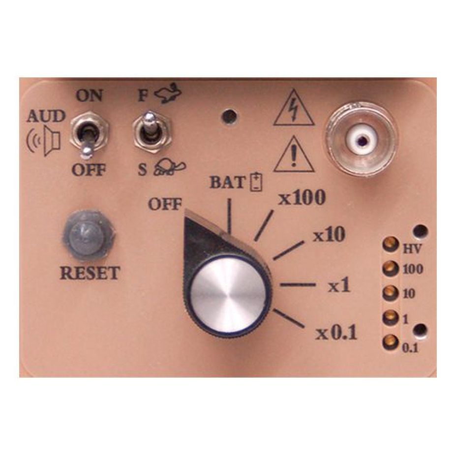 O instrumento é fabricado em alumínio fundido, com compartimento separado para pilhas e uma alça de metal que oferece robustez e qualidade que promovem proteção duradoura e aumentam a vida útil do instrumento. Os controles do painel frontal incluem uma chave rotativa para selecionar a escala, teste de bateria, chave “on / off” para áudio, chave para resposta “fast / slow” e botão de reset de contagens.